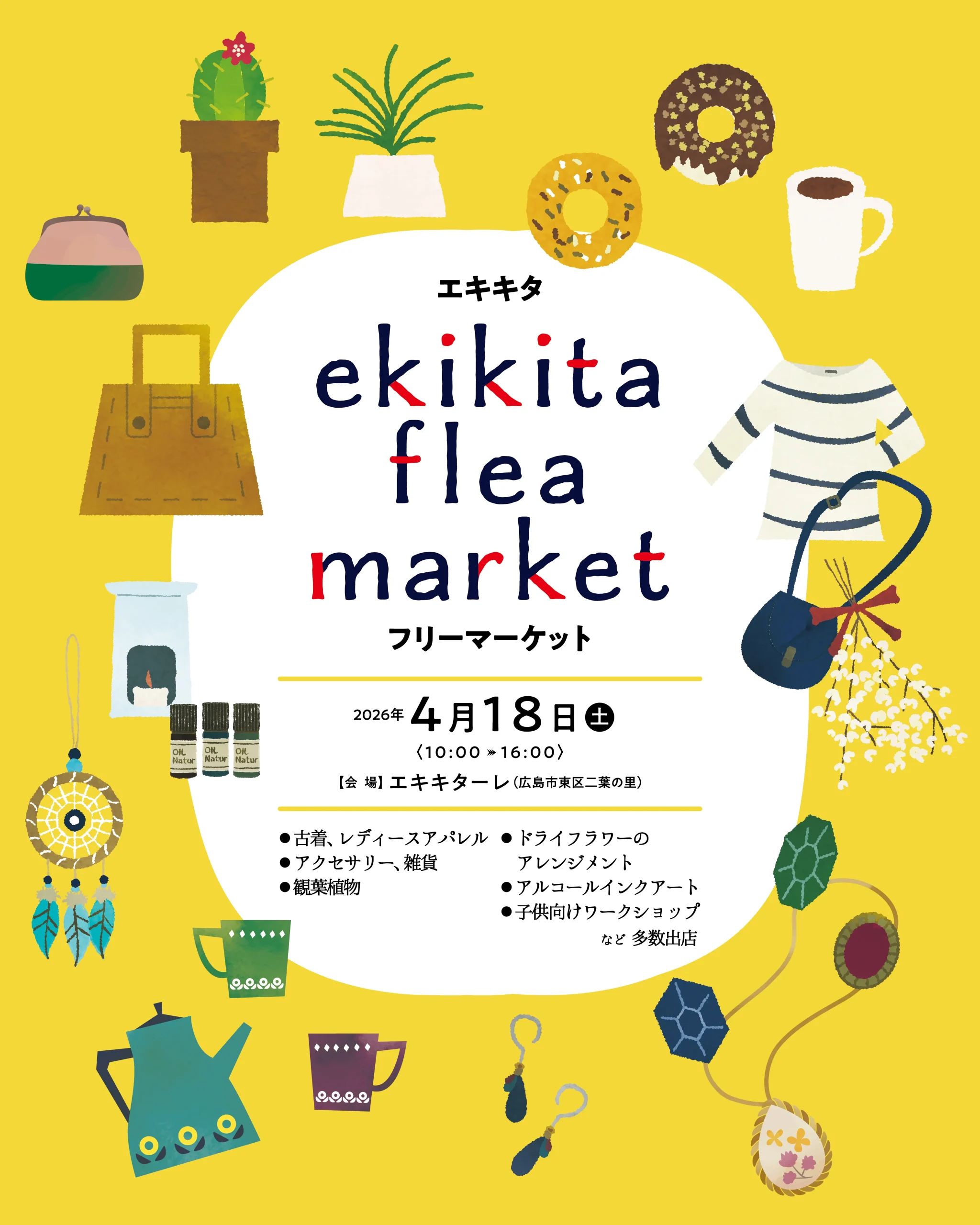 2026年04月07日 最新情報 4月18日、広島駅北口エキキターレにてフリーマーケットを開催いたします。 2026年4月18日(土)10:00~16:00 4月18日、広島駅北口エキキターレにてフリーマーケットを開催いたします。 春の心地よい季節の中、会場には古着や雑貨、ハンドメイドアイテムなど、個性豊かな店舗が多数出店。こ […]... `